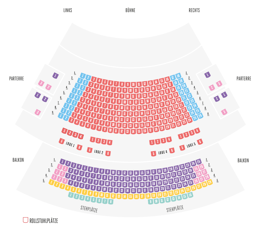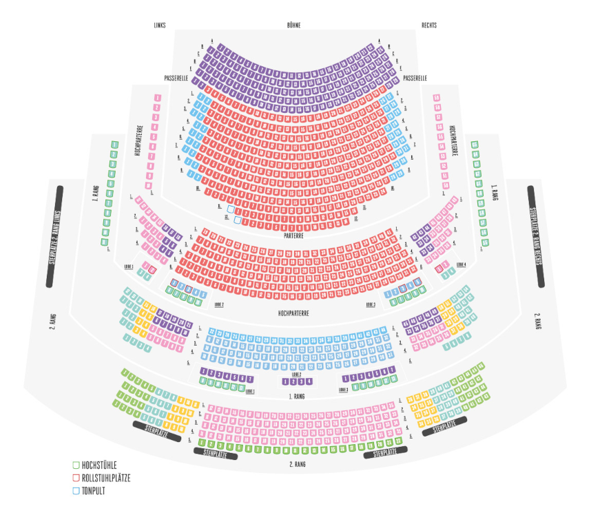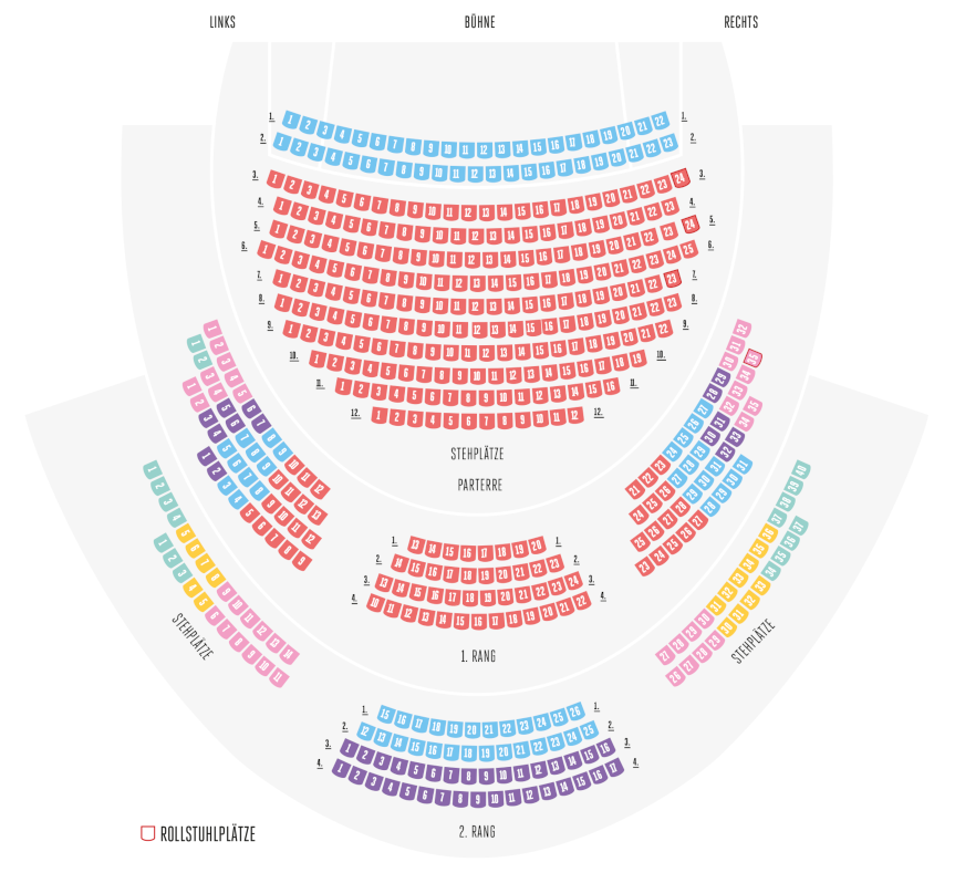 Up to 22 wheelchair spaces are available for wheelchair users and spaces for accompanying persons on the raised ground floor. Further places can be arranged in the first two rows on the ground floor. Wheelchair users and accompanying persons receive reduced admission tickets.