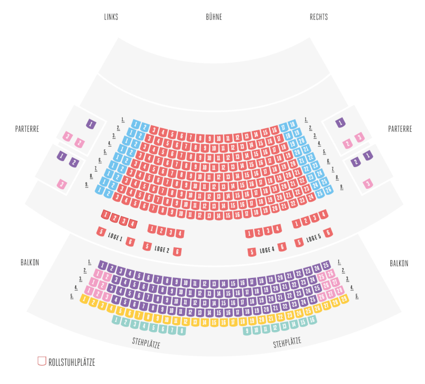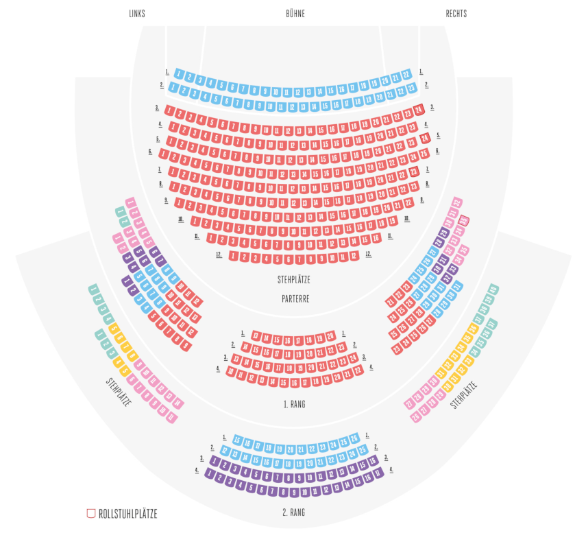 Bestuhlung der Reihen A bis E und der Passerelle bei ausgewählten Gastspielen und Sonderveranstaltungen. Ebenso kann es bei einzelnen Vorstellungen andere Preiszuordnungen geben.